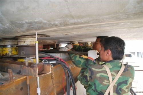 11、檢驗。先檢查鋼板周邊是否有漏膠,觀察膠液的色澤,硬化程度,并以小錘敲擊鋼板檢查有效粘接面積,不密實區(qū)可補鉆注膠孔和排氣孔進行補注。